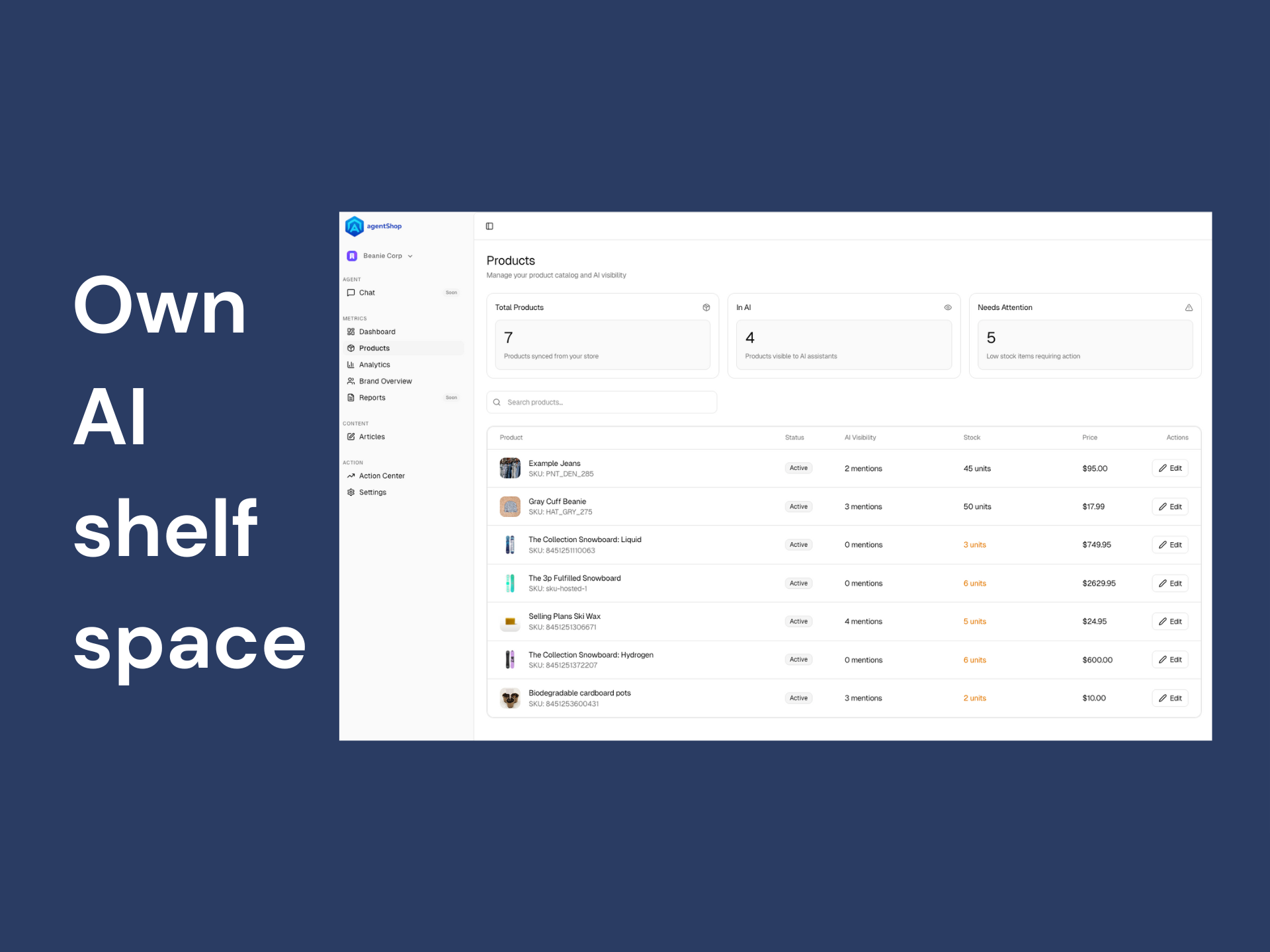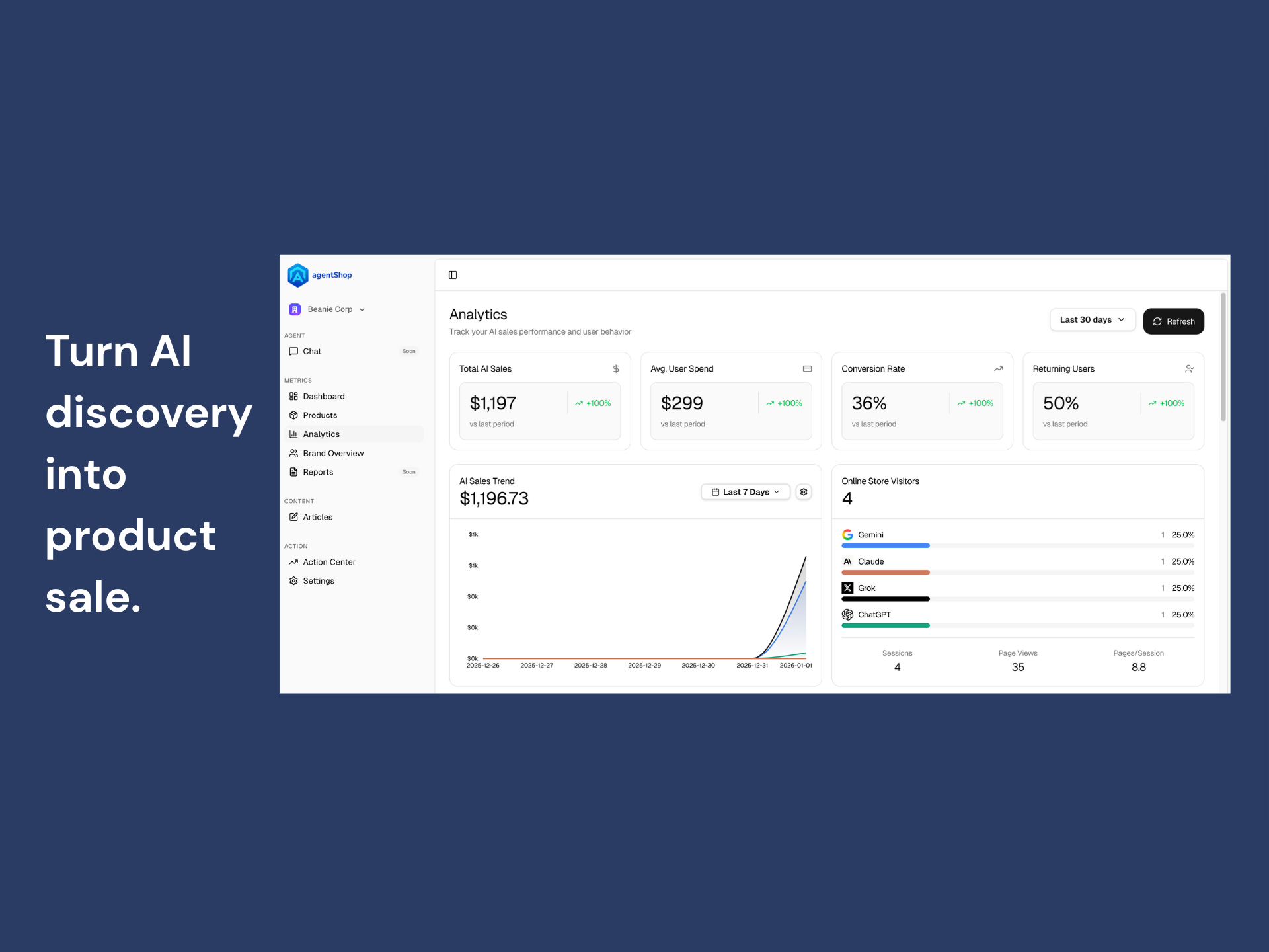 AgentShop helps ecommerce brands win the next storefront: AI-driven discovery. As shoppers increasingly ask ChatGPT, Perplexity, and Gemini what to buy, AgentShop turns that channel into something measurable and controllable—so your products show up more often, your catalog converts better, and you stop losing high-intent buyers to competitors you didn’t even know were being recommended.