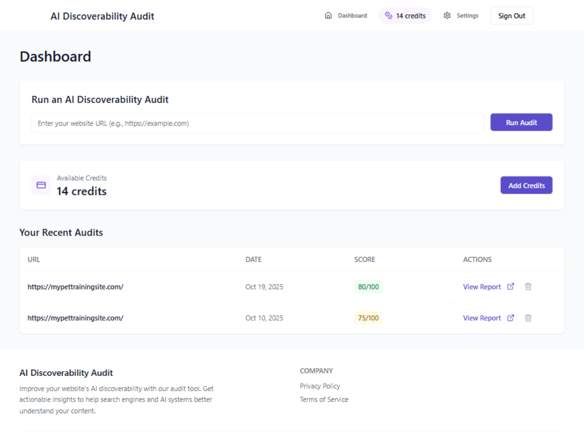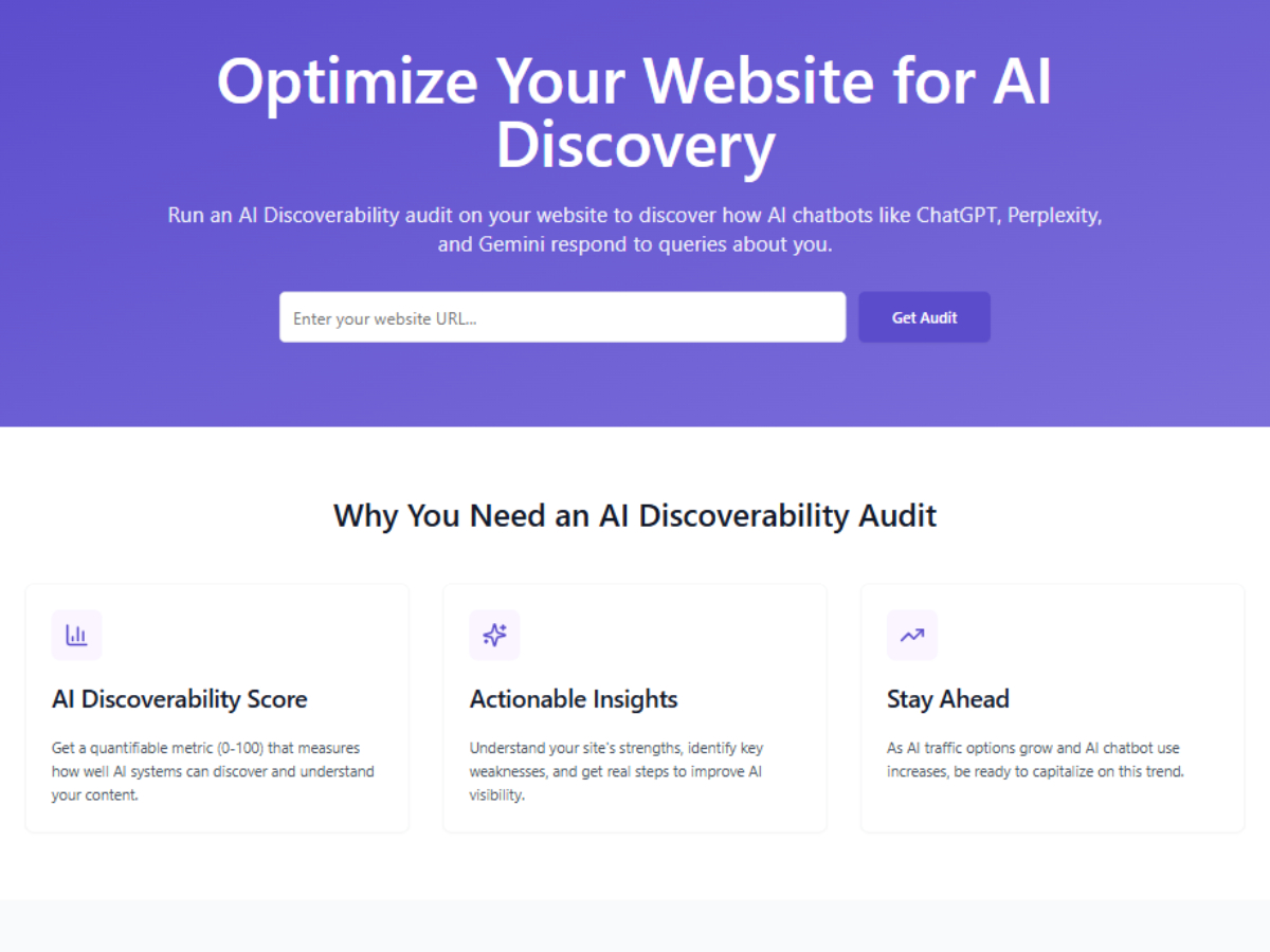 AI chatbots are quickly becoming the new search engines, but if they can’t understand your content, they can’t recommend you. AI Discoverability Audit shows exactly how one page of your site reads to AI assistants like ChatGPT, Perplexity, and Gemini, giving you an instant AI Discoverability Score (0–100) and a plain-language report explaining what AI gets right, what it misses, and how to fix it, with strengths and weaknesses analysis, concrete examples, step-by-step recommendations to improve visibility, and a free trial that includes one partial audit with no credit card required. Most websites aren’t written for AI comprehension yet, giving you a rare early-mover advantage, and this tool lets you see what AI actually understands about your content, track your progress as you improve, and stay visible as AI-driven discovery becomes the next wave of search. Thousands of business owners and creators are already optimizing for AI—make sure your site is one of them.