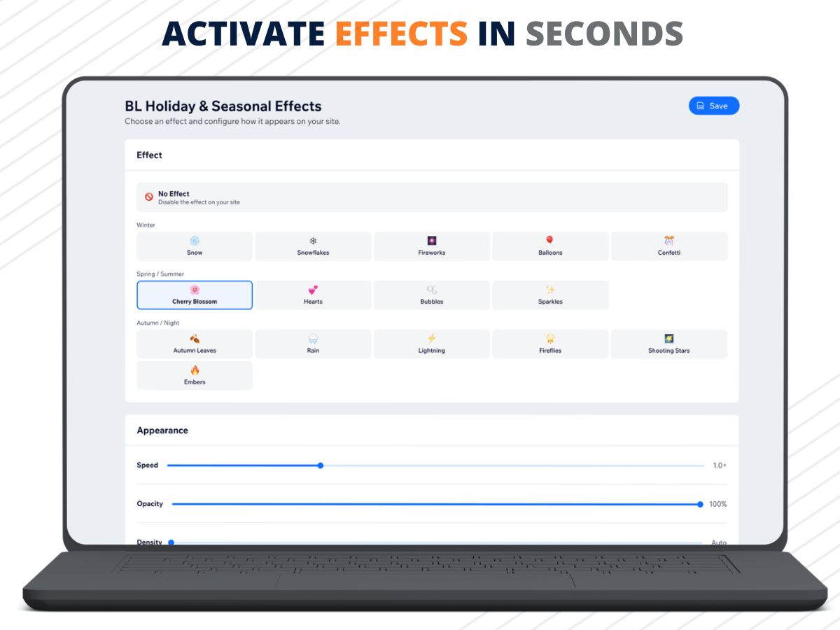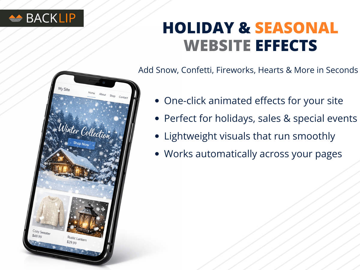 BL Holiday & Seasonal Effects lets you add animated website effects and create memorable seasonal experiences that help capture attention, improve engagement, and make your site feel more dynamic. Choose from a wide selection of effects, including snow, geometric snowflakes, fireworks, confetti, balloons, hearts, cherry blossom petals, bubbles, sparkles, autumn leaves, rain, lightning, fireflies, shooting stars, and embers. It is ideal for online stores, landing pages, and content websites that want to match their design to holidays, seasonal campaigns, sales events, and special promotions such as Christmas, Valentine’s Day, Halloween, New Year’s Eve, spring sales, and more. A simple visual dashboard gives you full control over speed, opacity, particle density, and z-index, with a live preview and no coding required. All animations run on a lightweight transparent canvas overlay so your content stays fully clickable, responsive, and fast, with no layout shift and no interruption to the browsing experience.