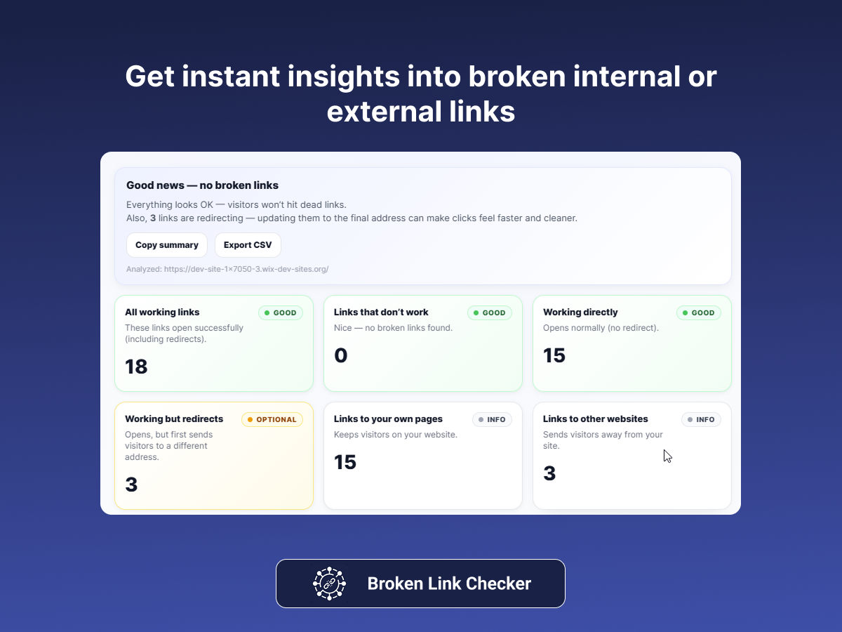 Broken Links Checker is a comprehensive site-health monitoring tool designed to help you maintain a smooth, reliable, and professional browsing experience for every visitor. Broken or outdated links can frustrate users, decrease trust, reduce conversions, and negatively impact search performance. This tool thoroughly scans your entire website—internal pages, external references, media URLs, and redirects—to detect dead links, 404 errors, missing resources, or redirect chains that slow down navigation. Each scan provides a clear, structured report that shows every problematic URL along with its exact source location, making it easy to fix issues without wasting time searching through your site. Whether you manage an online store, blog, portfolio, or business site, Broken Links Checker helps ensure your visitors always land where they should. Its intuitive interface, real-time analysis, and instant recheck system allow you to monitor link health continuously and keep your website performing at its best.