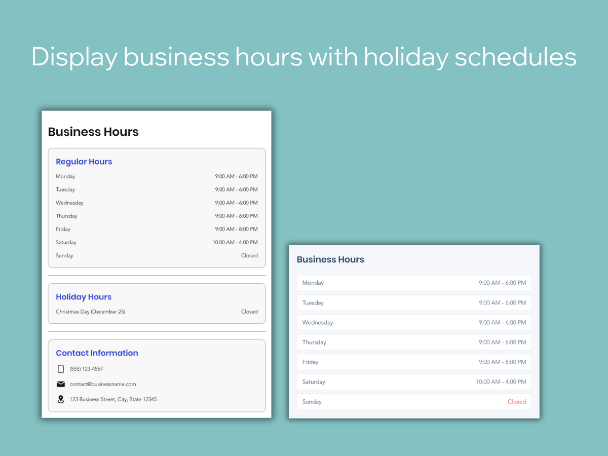 • Display business hours with holiday schedules