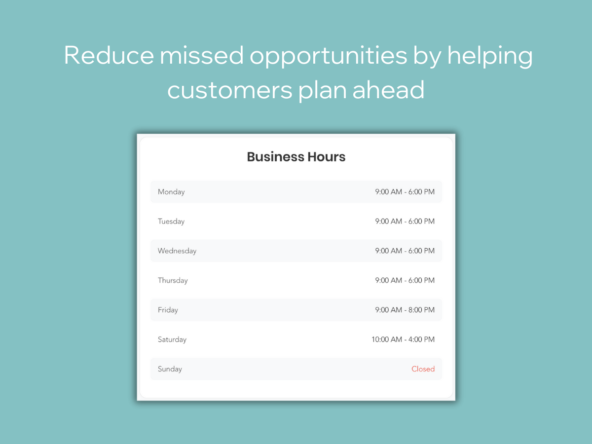 Make it easy for customers to know when you’re open with the Business Hours Widget. This simple, intuitive app lets you showcase your opening hours right on your website, so visitors always know the best time to contact or visit you. Improve customer experience with clear, always-up-to-date hours and reduce missed opportunities by helping customers plan ahead