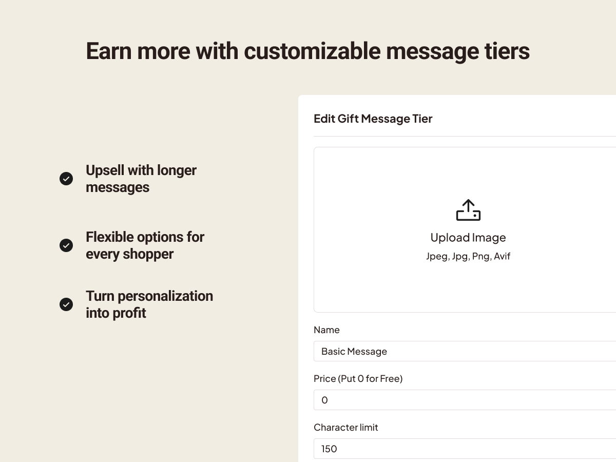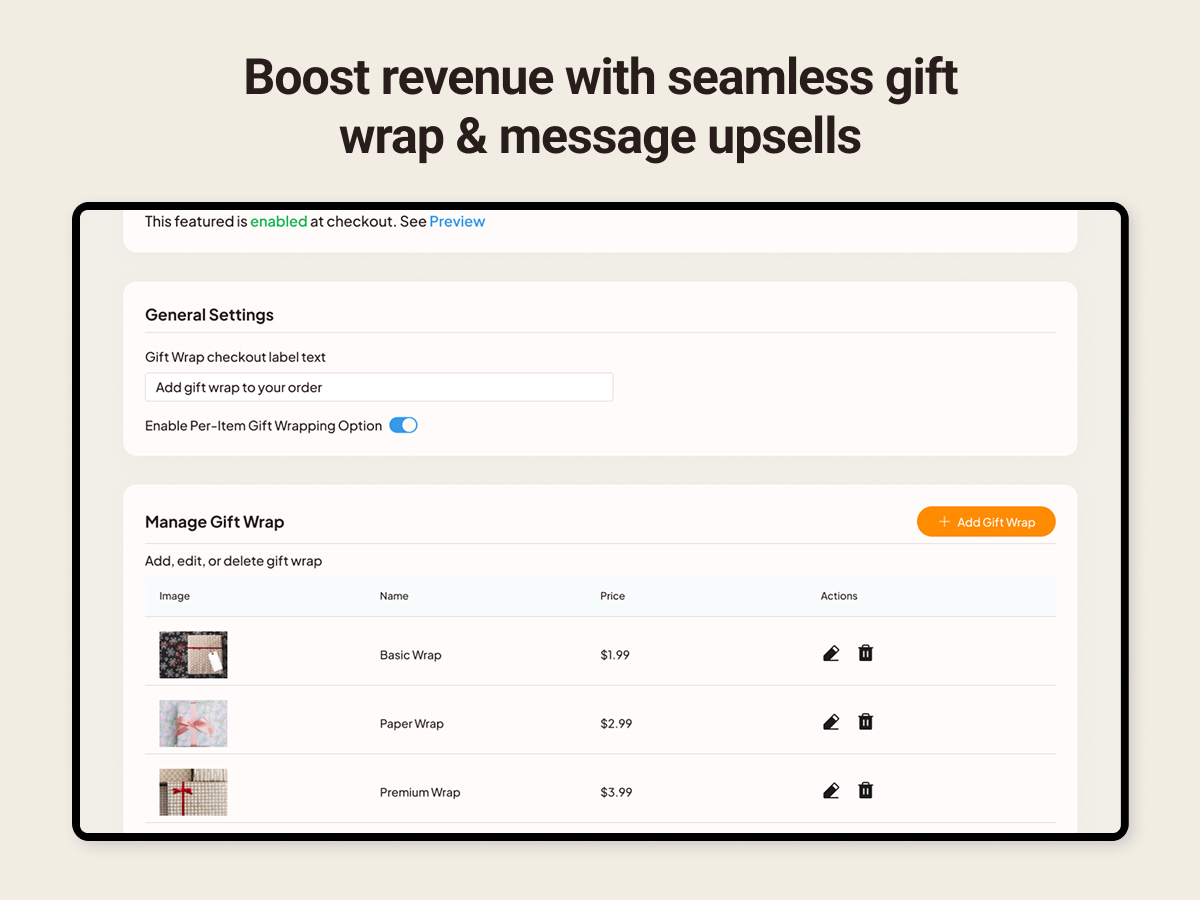• Effortlessly create, customize, and upsell several gift wrap and gift message options, and set them as either free or for a price; get notified in your orders dashboard