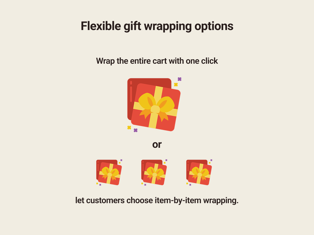 • Your customers can choose to wrap the entire cart for one fee or wrap each individual item in the cart, with the price multiplying automatically based on their wrap selection and what's in their cart