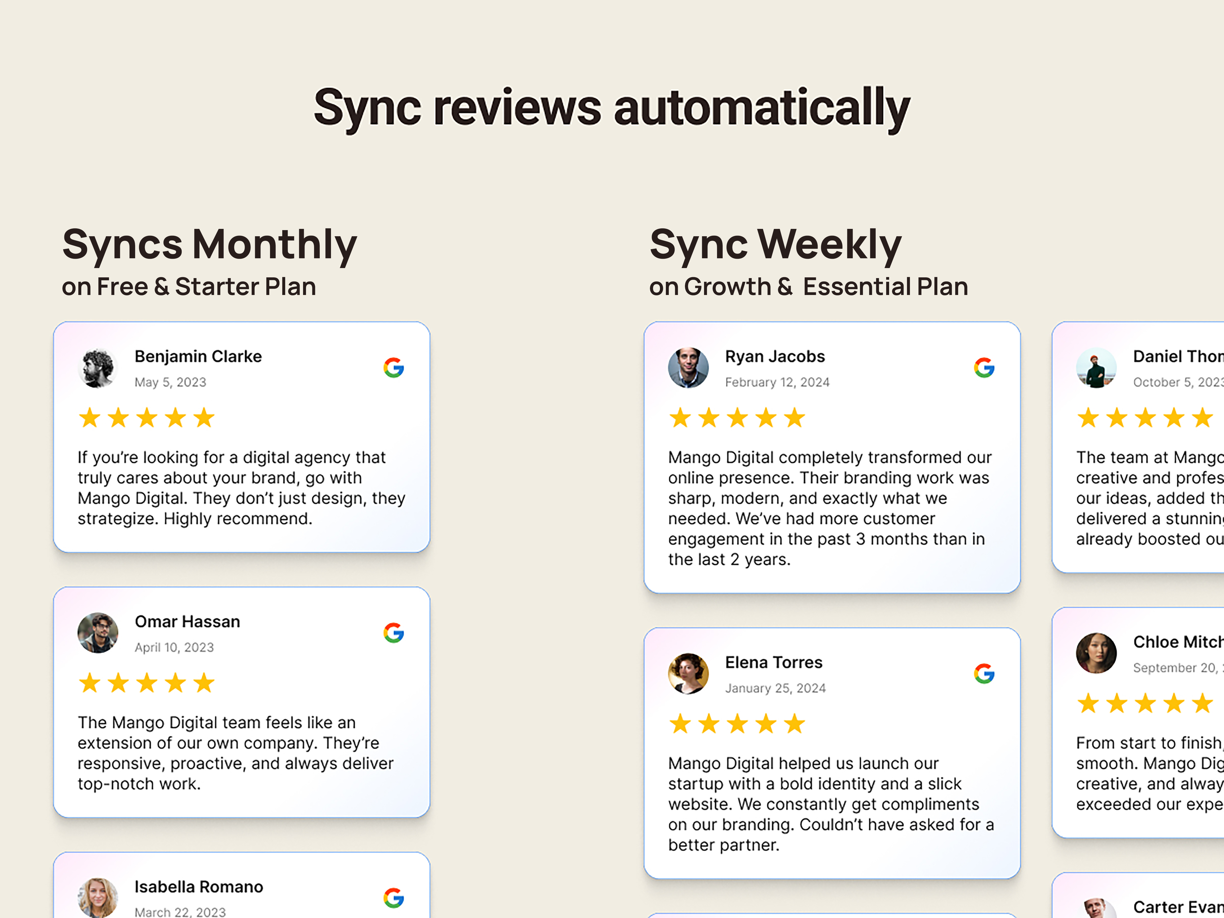 Display and automatically sync Google Reviews on your site — plus Facebook, Trustpilot, Tripadvisor, Yelp, Booking.com, Airbnb, Expedia, and OpenTable
