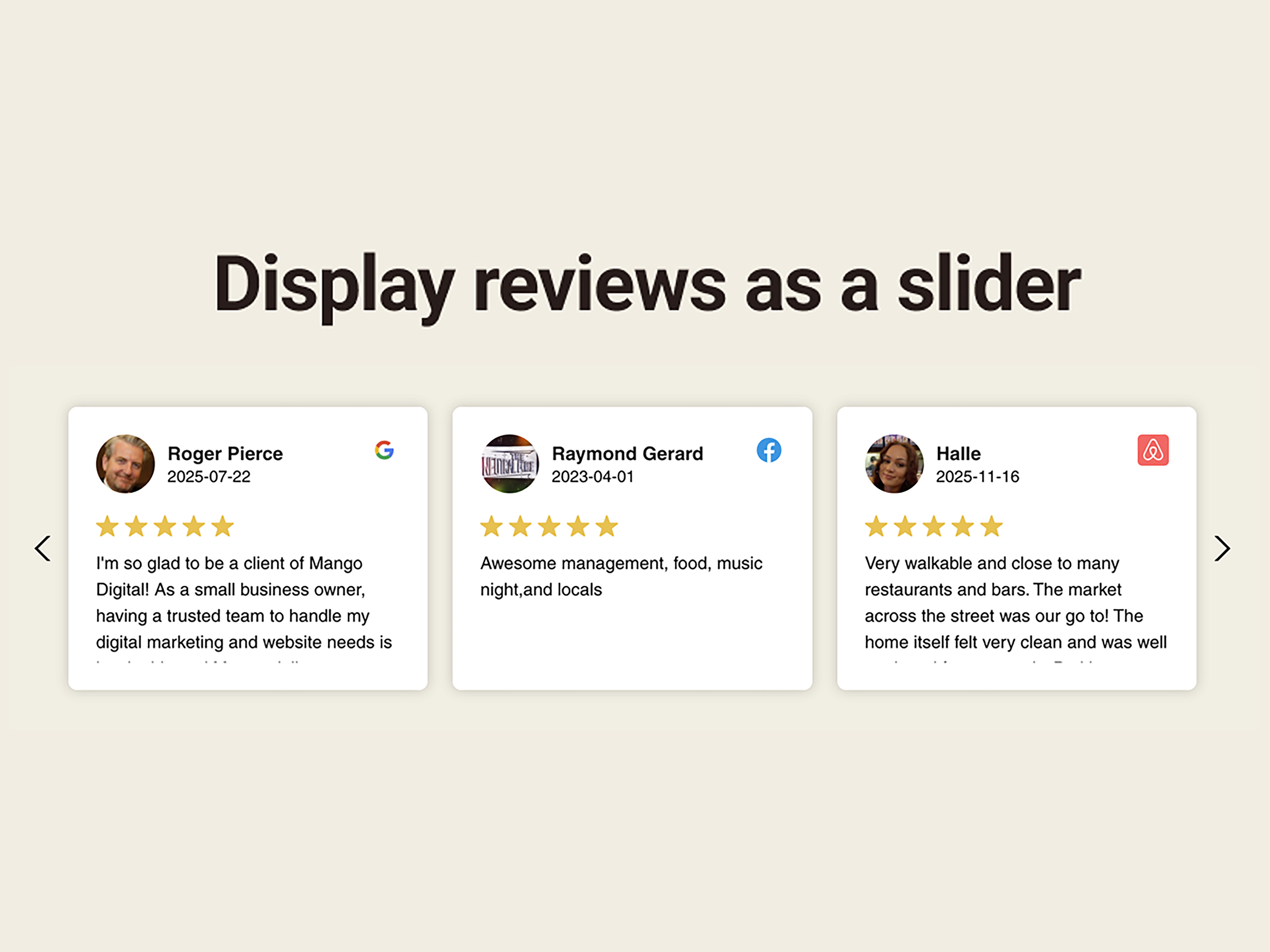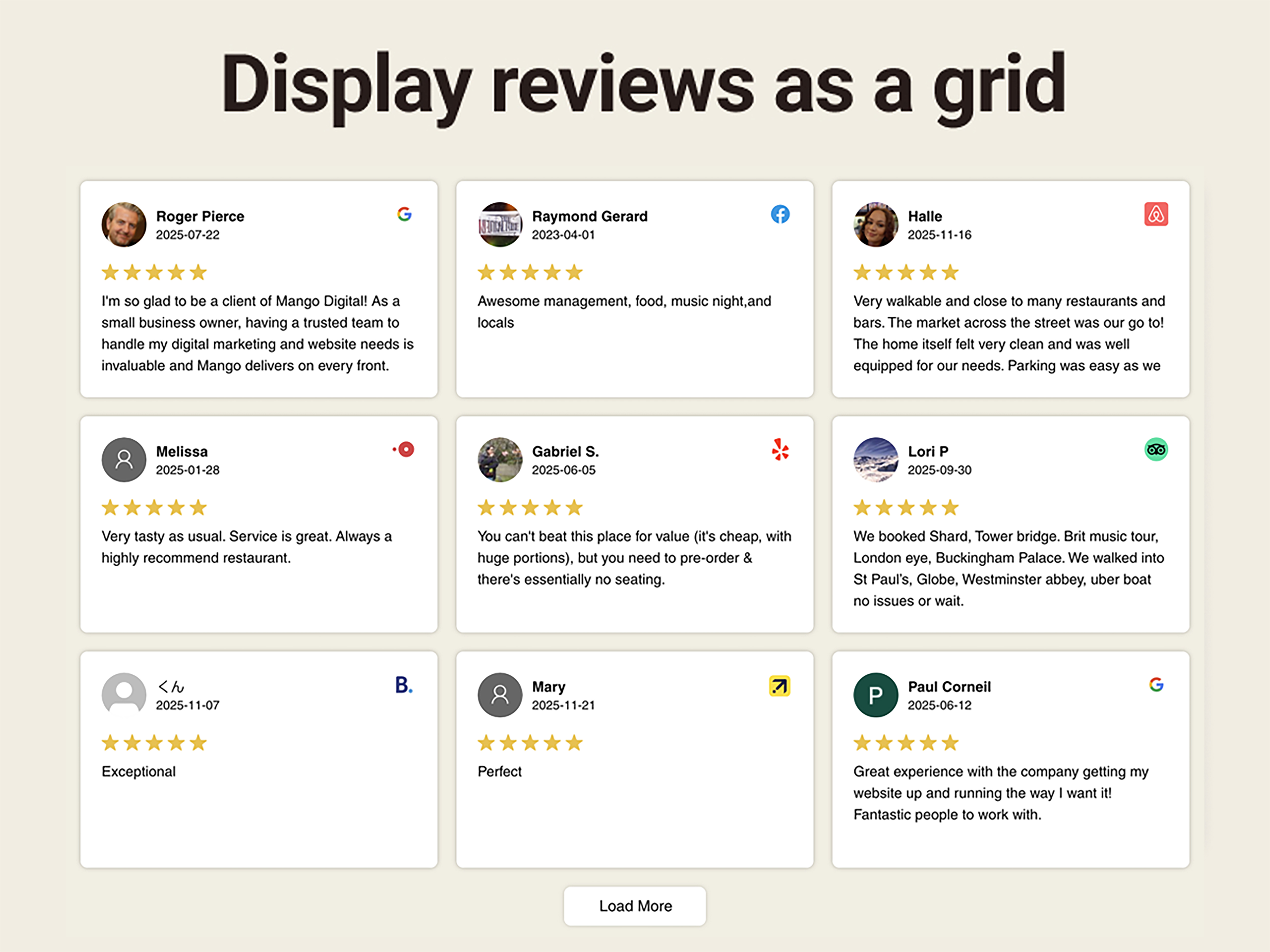 Boost website conversions with Google Reviews. Display and sync your Google Business Profile reviews beautifully on your site. Our Google Reviews widget also supports Facebook, Tripadvisor, OpenTable, Yelp, Airbnb, Expedia, TrustPilot, and Booking.com reviews—giving you complete review management in one customizable solution.