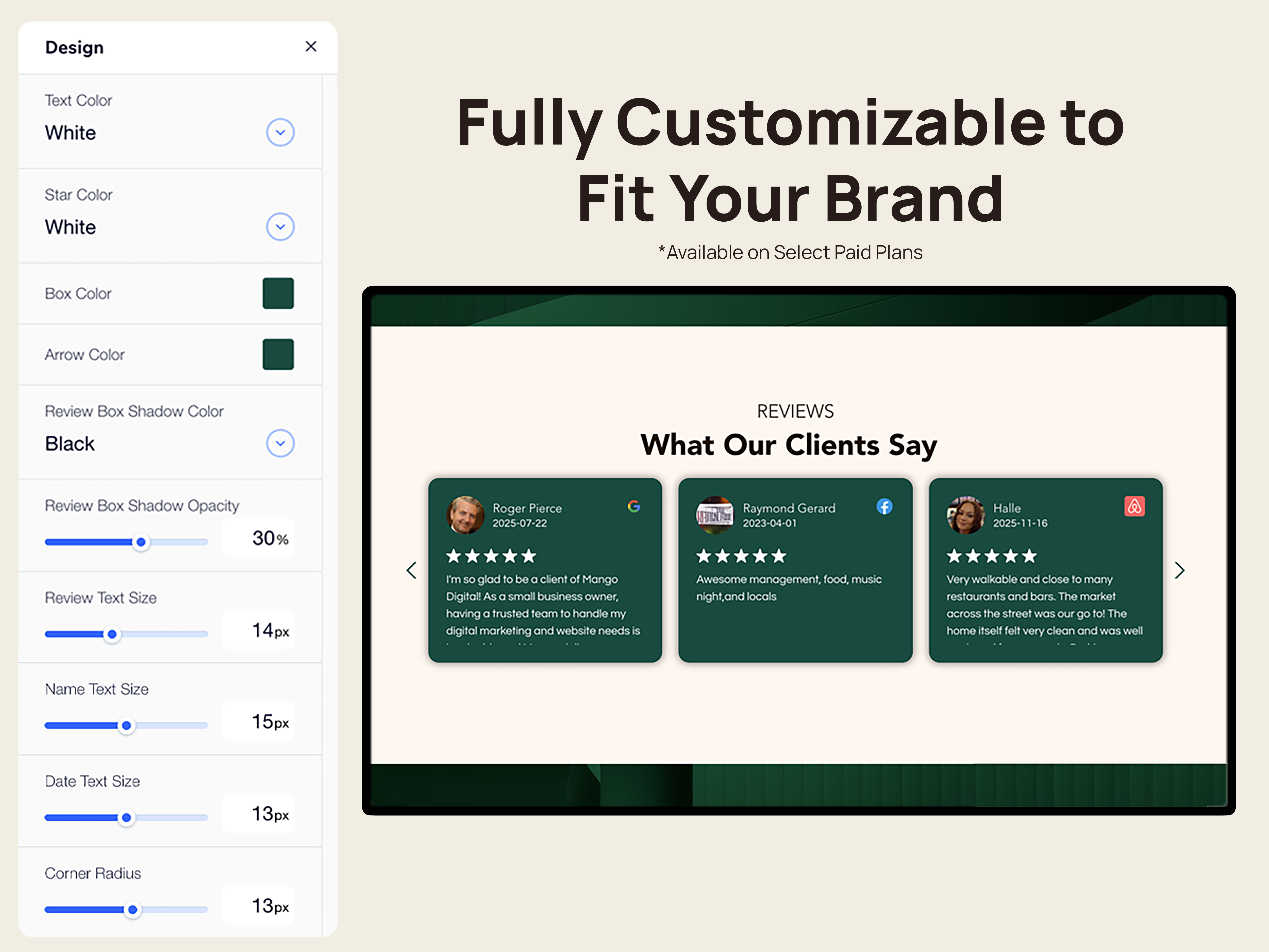 Filter out poorly rated reviews to show only the most positive feedback and choose from light, grey, and dark design presets to perfectly match your website