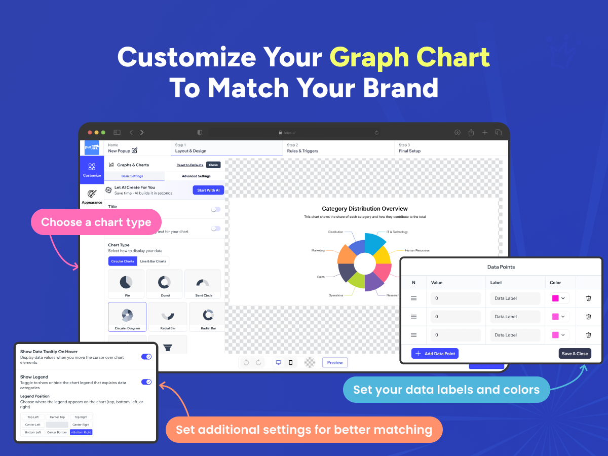 Grafy a tabulky usnadňují prezentaci dat v vizuálním, poutavém formátu - proměňují složité informace v něco, co vaši zákazníci okamžitě pochopí. Bez ohledu na to, zda porovnáváte produkty nebo zdůrazňujete pokrok ve prodejích, můžete vytvářet úchvatné, responzivní grafy, které ladí s designem vašeho obchodu. S 16 typy grafů a plnými možnostmi přizpůsobení je perfektní pro zobrazení transparentnosti, sledování výkonu a přidání vizuálního vyprávění na vaše stránky.