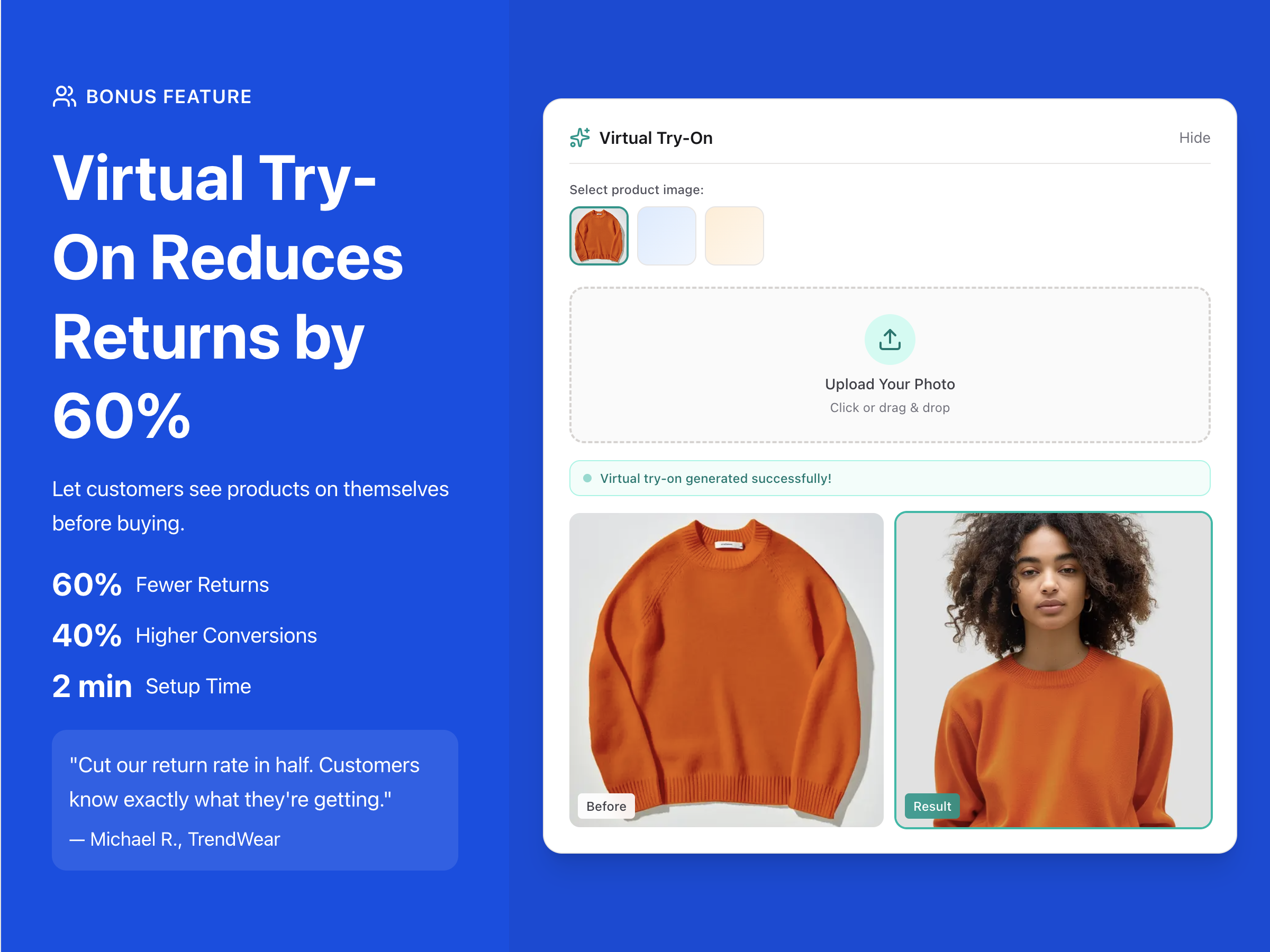 • Virtual Try-On That Increases Buyer Confidence; Let shoppers see products on real-looking AI models before checkout, reducing returns—without allowing image downloads