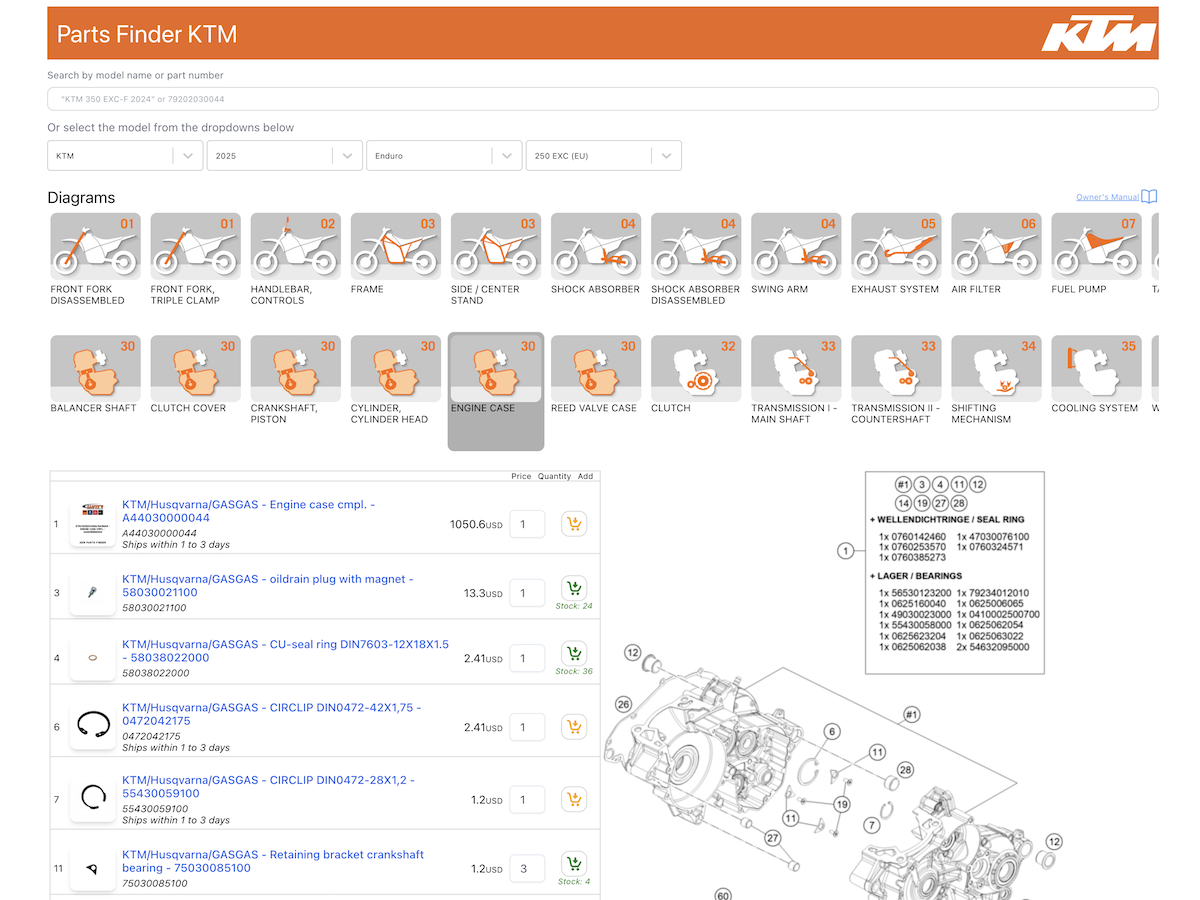 Connect your store to mechanical diagrams to sell KTM OEM spare parts.