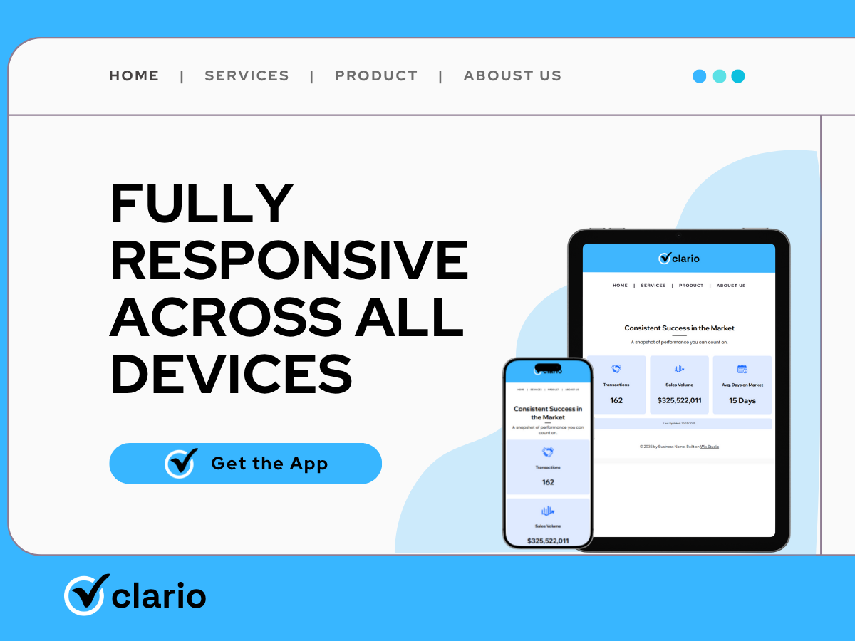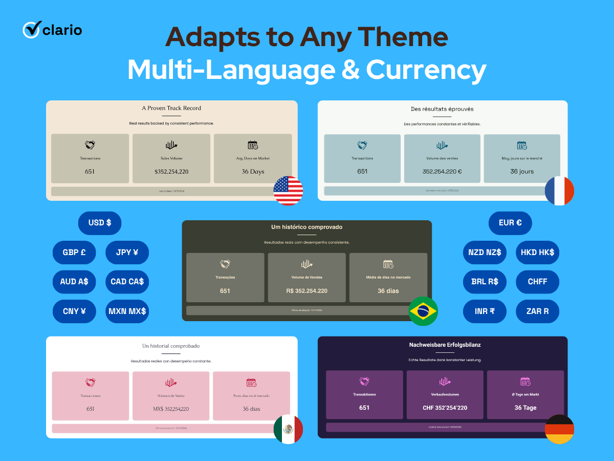 Show proven results, instantly – Displays your Transactions, Sales Volume, Avg. Days on Market and an optional Last Updated badge with smooth count-up animation