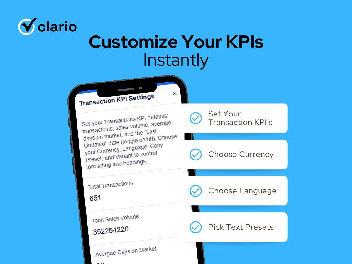 ✓ Full KPI widget: transactions, sales volume, days on market