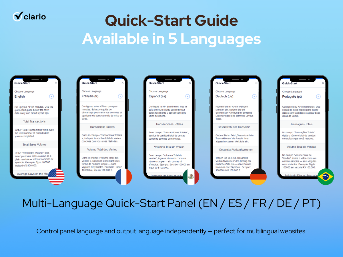 Customize to your brand – Pick currency, language (EN/ES/FR/DE/PT), tone presets (Professional, Minimal, Casual, Data-Driven, Premium) and 5 copy variants to match your voice