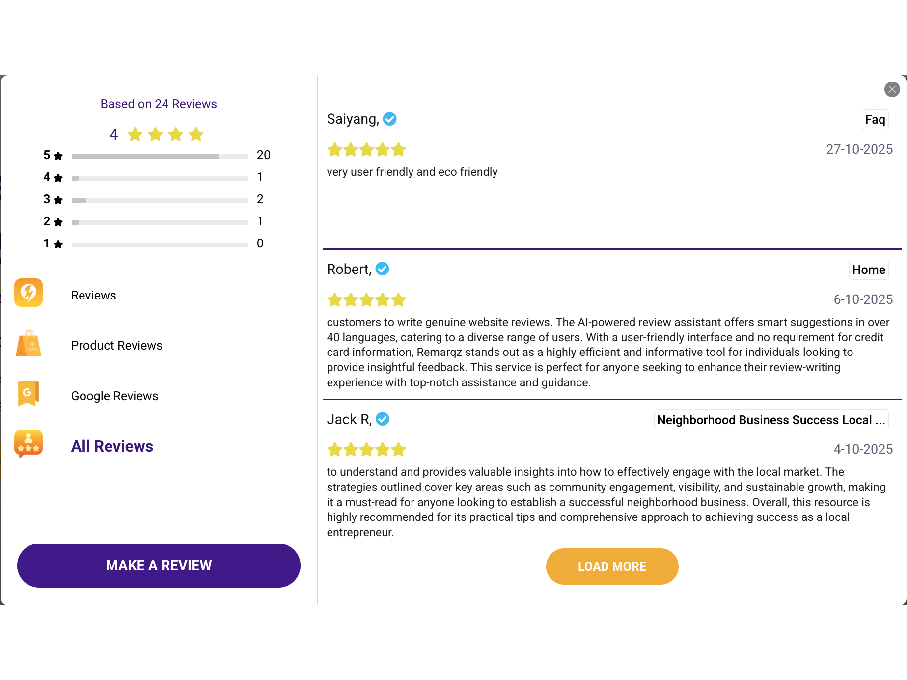 Experience the full power of Remarqz for 2 weeks - completely FREE, no credit card required. Unlimited reviews, Google sync, AI assistant, and full customization. After your trial, keep using our FREE forever plan with 6 reviews visible and unlimited in you