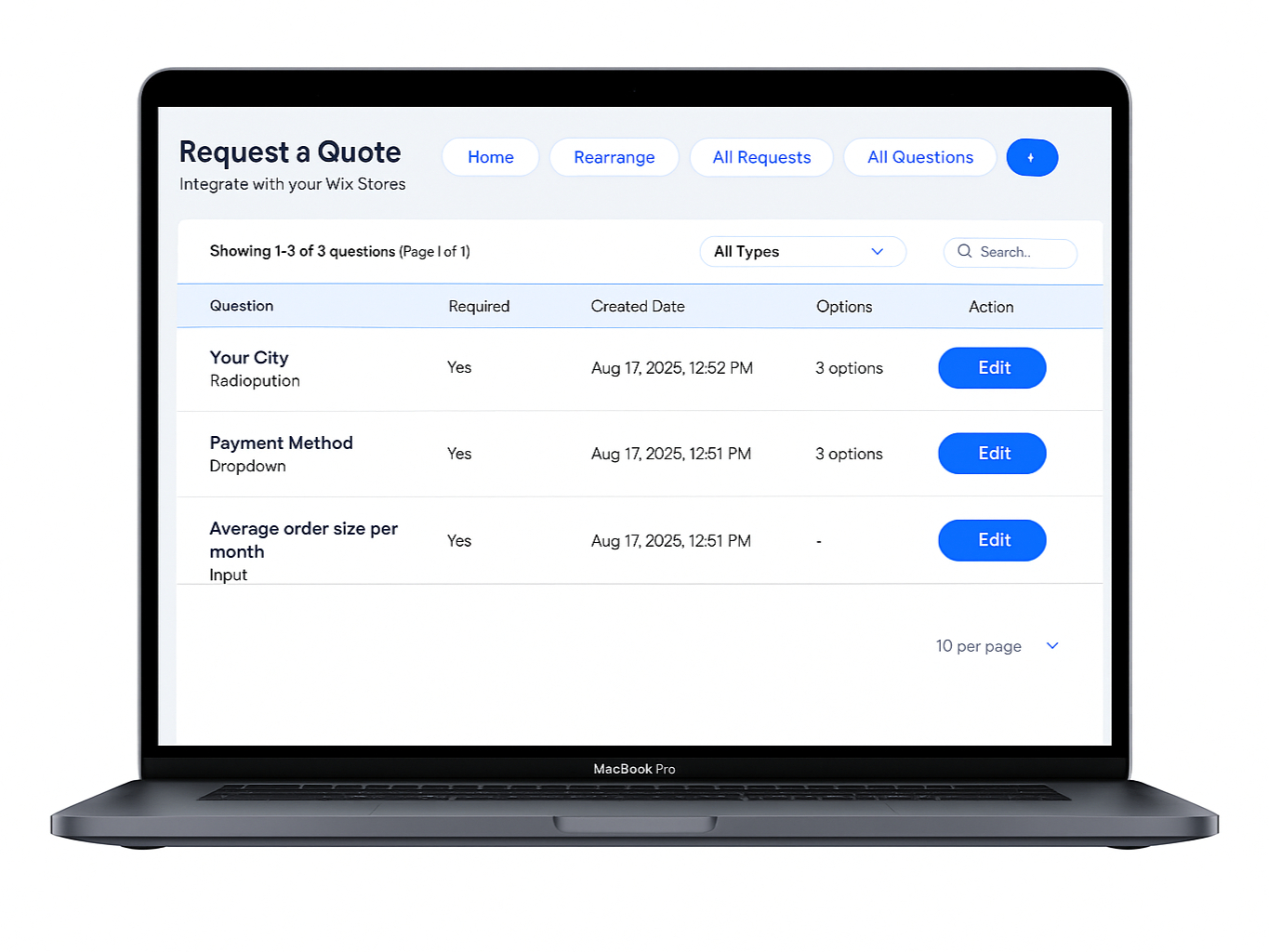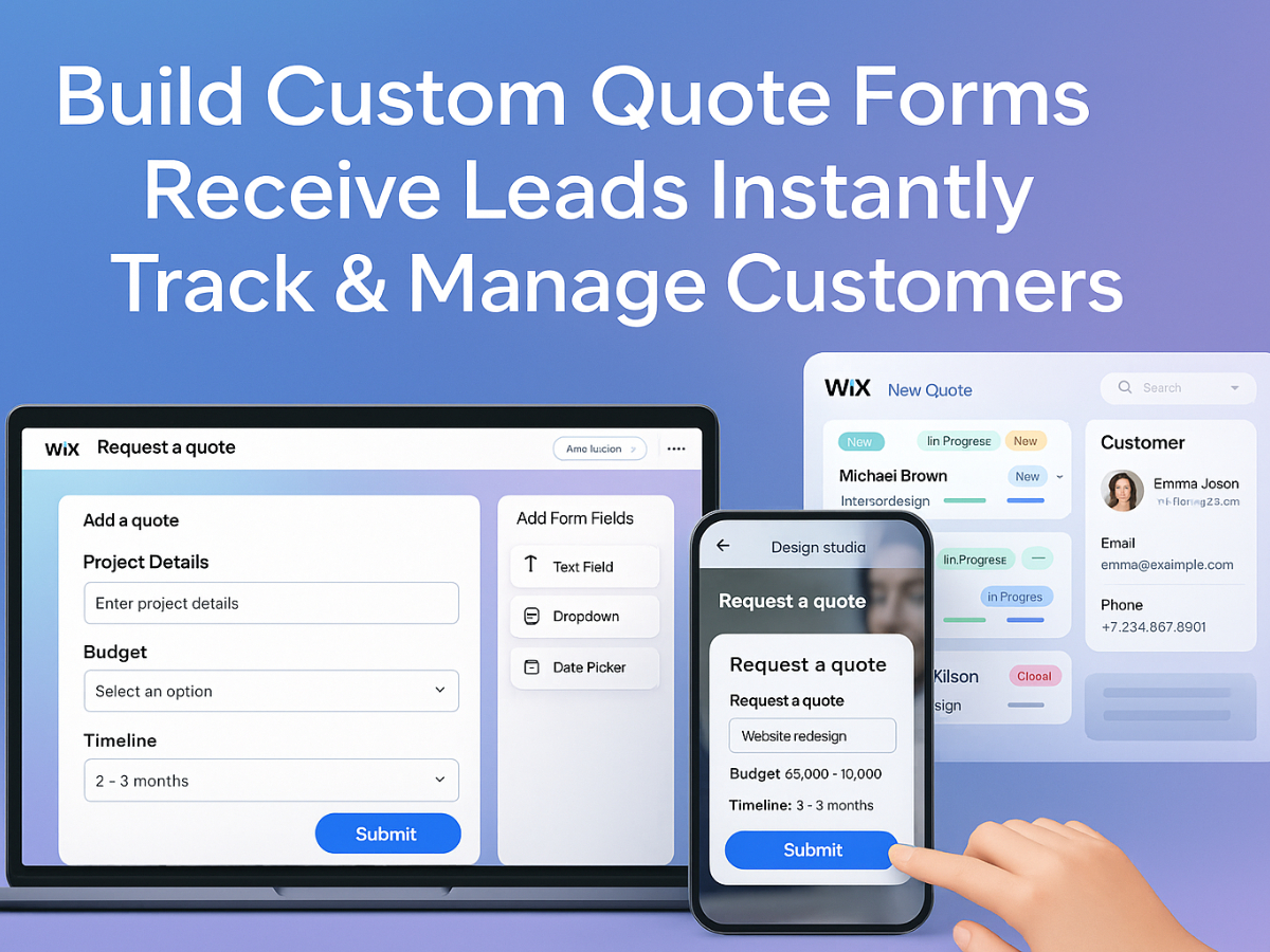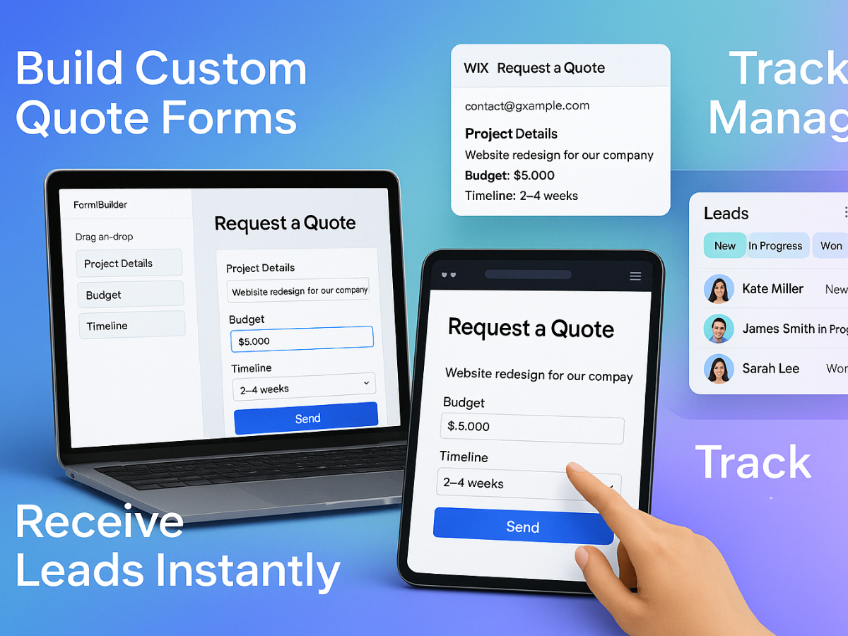 The Request a Quote App is a dynamic form builder for WlX websites that allows business owners to create custom quote request forms for their products. Customers can fill out these personalised forms with questions like project details, budget, timeline, etc., and when submitted, the business owner automatically receives a formatted email with all the responses and can manage these leads through a built-in dashboard with status tracking and customer management features. The app operates on a freemium model with plan-based limitations on the number of questions and responses.